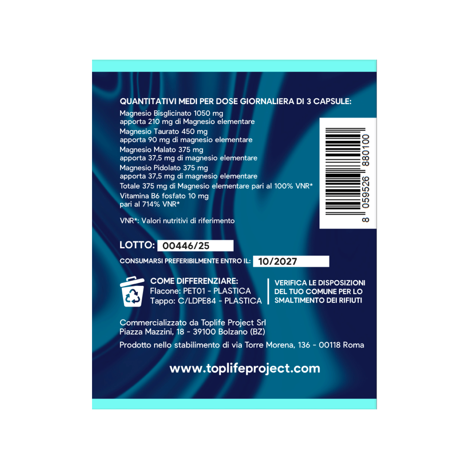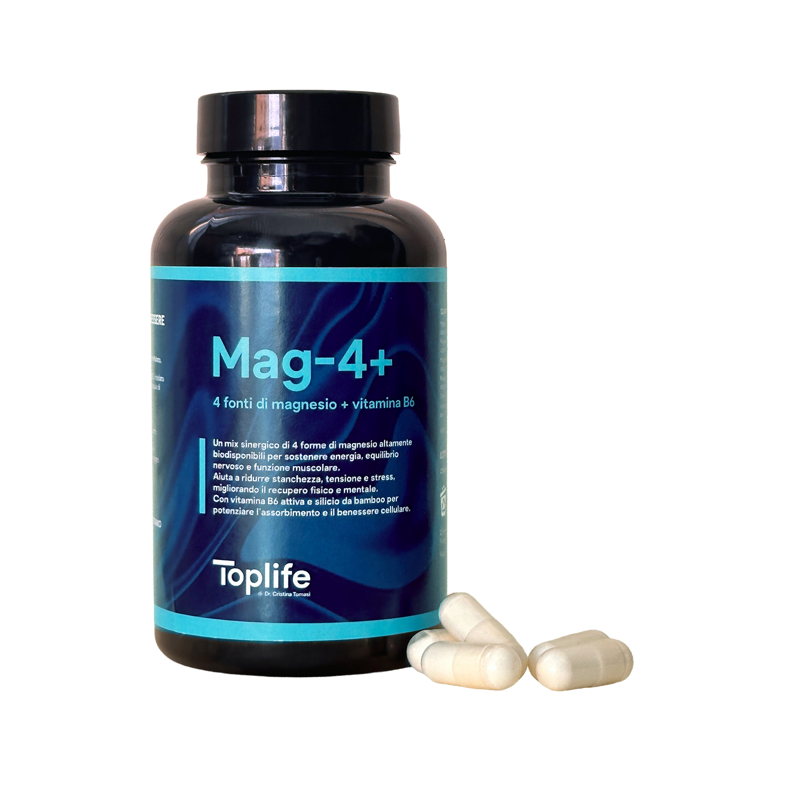 Mag-4+ è l’integratore di magnesio più completo della linea Top Life, formulato per garantire massima biodisponibilità, tollerabilità e azione sinergica su sistema nervoso, muscoli ed energia cellulare.